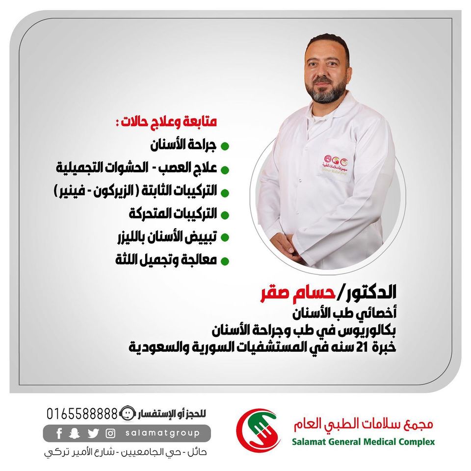 د/حسام صقر (مجمع سلامات) أخصائي طب الأسنان حاصل علي بكالوريوس في طب وجراحة الأسنان خبرة 21 سنة في المستشفيات السورية والسعودية admin