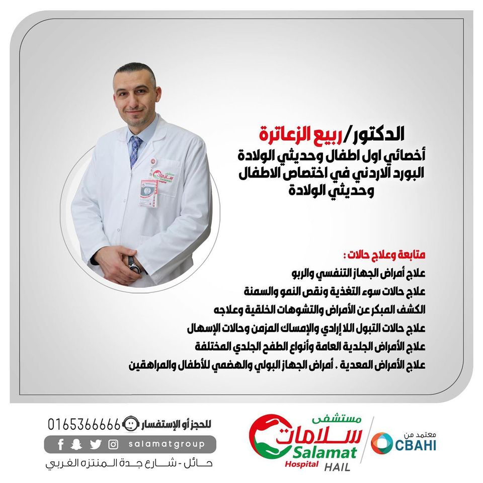 د/ ربيع الزعاترة (مستشفي سلامات) أخصائي اول اطفال وحديثي الولادة حاصل علي البورد الأردني في اختصاص الأطفال وحديثي الولادة admin